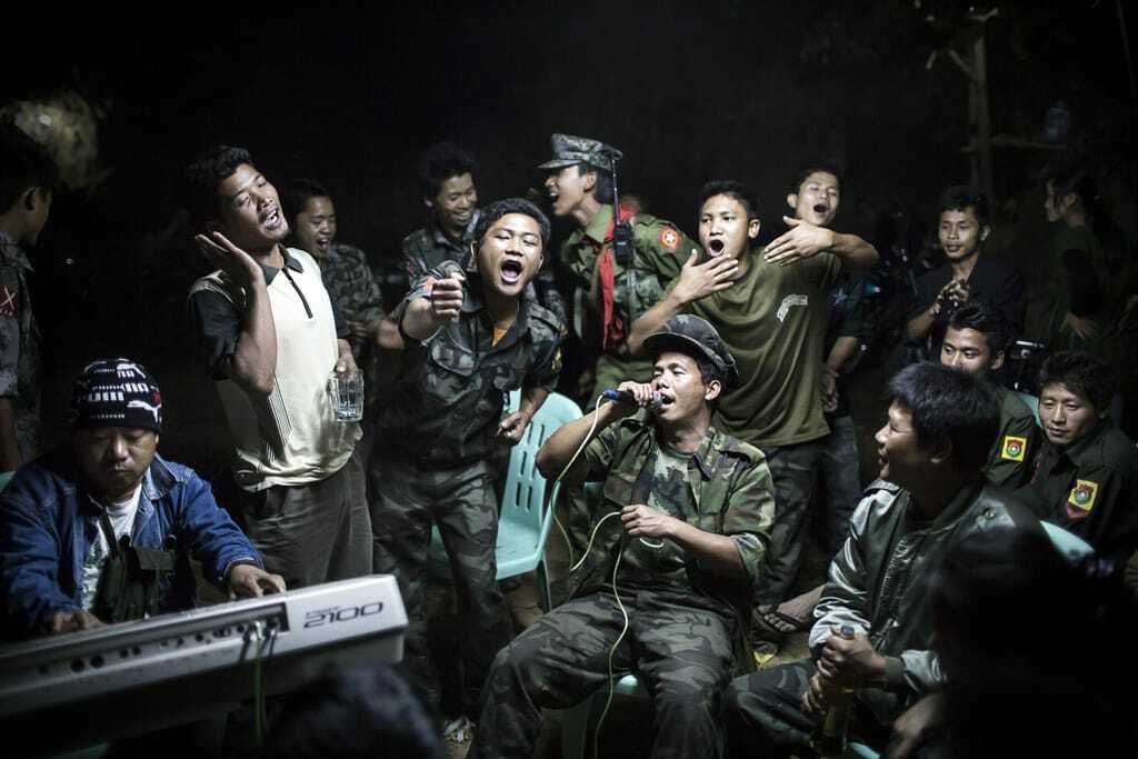In der Stadt Laiza, im Kachin-Staat, im Norden Birmas (Myanmar), trinken und singen Soldaten der Unabhängigkeitsarmee (KIA) bei der Beerdigung eines ihrer Kommandanten. Die Stadt wurde vom birmanischen Militär belagert. Die Kachin-Revolte war einer von zahlreichen ethnischen Aufständen nachdem die Militärjunta, die das Land über 40 Jahre regiert hatte, die Zügel gelockert hatte und mehr Demokratie zuließ. Kurz nach der Unabhängigkeit Birmas 1948 hatte der Kachin-Staat einen halbautonomen Status bekommen. In den 60er Jahren kam es zu einem Aufstand gegen die Zentralregierung von Myanmar mit der Forderung nach mehr Unabhängigkeit. 1994 wurde ein Waffenstillstand ausgehandelt, aber die KIA weigerte sich, ihr gesamtes Waffenarsenal abzugeben und unterhielt weiterhin einige Camps im Dschungel. 2011 brach erneut ein Konflikt aus.