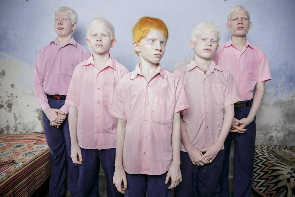 Blinde Albino-Schüler stehen in Westbengalen, Indien, in der Vivekananda-Missionsschule, einem Internat für Blinde, in einem Schlafsaal. In der Schule lernen die blinden Kinder aus unterprivilegierten Schichten, die sonst vielleicht hätten betteln müssen, überlebenswichtige Fähigkeiten.