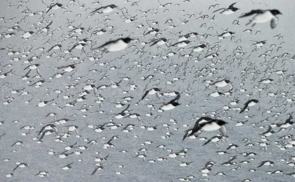 Trottellummen (Uria aalge) fliegen über Vardø, im Nordosten Norwegens. Die Lummen sind die größte Art der Alke und eine der in den gemäßigten und kälteren Regionen der Nordhalbkugel am häufigsten vorkommenden Meeresvogelarten. Der Vogel lebt in Gruppen und brütet in großen Kolonien mit zehntausenden Tieren.