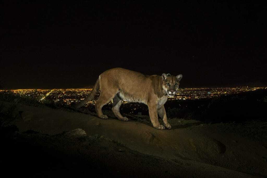 Ein Puma, der gerade zwei stark befahrene Highways überquert hat, geht über einen Pfad im Griffith Park, Los Angeles.