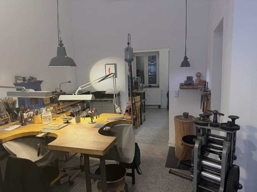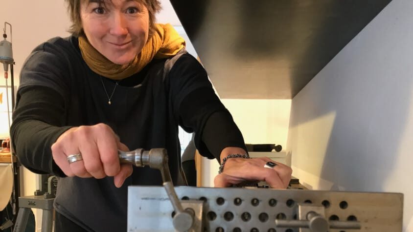 Wer die Goldschmiede Schmelztiegel im Würzburger Mainviertel betritt, landet mitten in der Werkstatt. Vorne stehen Walze und Ziehbank aus Stahl. Es riecht nach Metall, nach gereinigtem Werkzeug, nach Holz von der Werkbank. Ein paar Schritte weiter hinten steht die Esse, die Schmelz- und Lötstation, geschützt von feuerfesten Steinen. Eva Katz bleibt dort stehen, bindet sich die Schürze um und setzt die Schutzbrille auf. Dann richtet sie den Tiegel aus und zündet den Brenner. Die Flamme zischt, blau und konzentriert, und der Metallgeruch wird schärfer.
