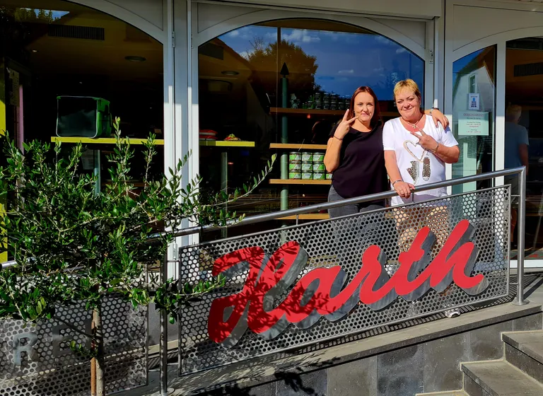 Jenny Oberst-Harth (links) und Anja Beck-Hardt vor ihrer Familienmetzgerei im rheinland-pfälzischen Stadecke-Elsheim. - © Privat