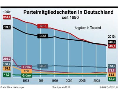 Nach Niedermayers Untersuchung hat die CDU seit der Wiedervereinigung und dem Zusammenschluss von West- und Ost-CDU über ein Drittel ihrer Mitglieder verloren, bei der SPD war es sogar fast die Hälfte. Die CSU büßte im selben Zeitraum 17 Prozent ihrer Mitglieder ein. Am deutlichsten fällt der Mitgliederschwund bei den Liberalen (rund 60 Prozent) und den Linken (Minus 73 Prozent) aus. Zulegen konnten einzig die Grünen, die in den vergangenen 20 Jahren 28 Prozent an Mitgliedern gewinnen konnten.
