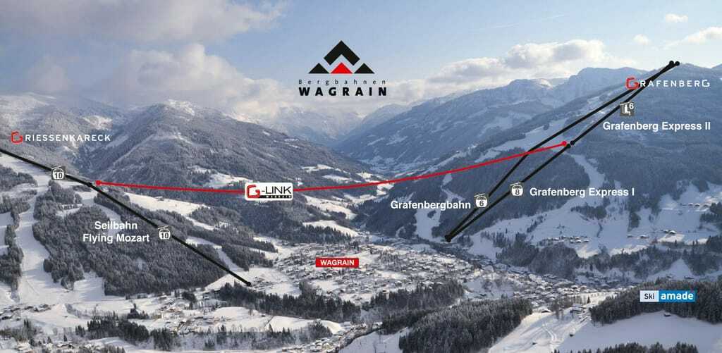 Eine weitere Prämiere gibt es im Salzburger Land, genauer in Wagrain. Das Skigebiet besteht aus den zwei Skibergen Grafenberg und Grießenkareck die durch das Tal und dem Örtchen Wagrain getrennt werden. Bisher mussten Wintersportler ihre Ski abschnallen und durch den Ort laufen oder auf die Skibusverbindung zurückgreifen. Ab diesem Herbst verbindet der „G-Link Wagrain“ die Mittelstation der „Flying Mozart-Seilbahn“ mit der Bergstation des „Grafenberg Express 1“. Zwei knallrote Gondeln die bis zu 130 Personen Platz bieten pendeln zwischen den Skibergen hin und her. In einer Höhe von bis zu 200 Metern wird die sechs minütige Fahrt zum Erlebnis. Die rund zwei Kilometer lange Strecke wird ohne weitere Stützpfeiler überwunden. Nur an den beiden Bergstationen wurden zwei 35 Meter hohe Stützen errichtet.