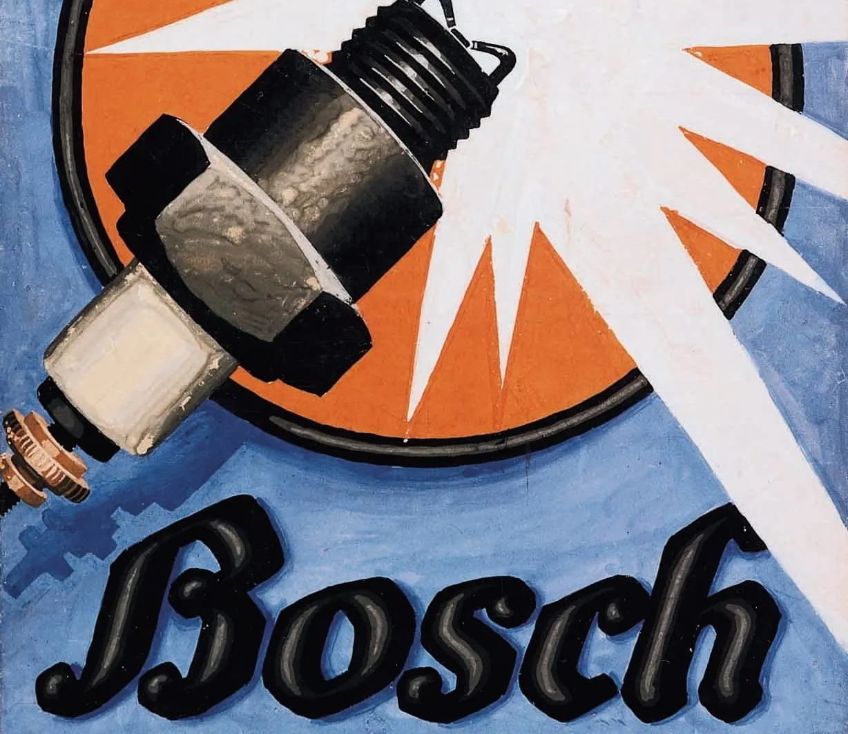 Im Jahr 1902 ließ sich Robert Bosch erstmals eine Zündkerze in Kombination mit einem Hochspannungsmagnetzünder patentieren. Das Bild zeigt einen Plakatentwurf einer von 1921.