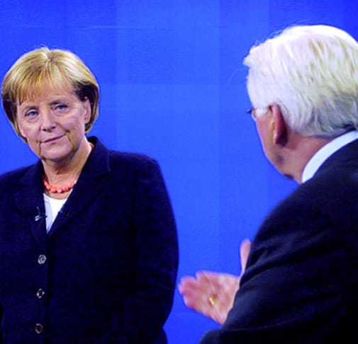 Wenig disktutierten Bundeskanzlerin Angela Merkel (CDU) und ihr Heruasforderer Frank-Walter Steinmeier miteinander. Foto: ddp