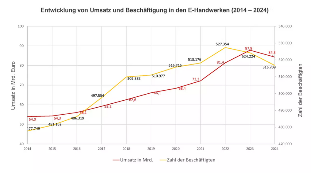 Wie bereits prognostiziert, zeigt die aktuelle Auswertung einen deutlichen Rückgang des Umsatzes um 4,0 Prozent auf 84,3 Milliarden Euro. Im Jahr 2023 lag dieser noch bei 87,8 Milliarden Euro. Ein kontinuierlicher Anstieg in den vergangenen Jahren wird nun durch diese negative Entwicklung gestoppt. Das spiegelt sich auch in der ZVEH-Frühjahrskonjunkturumfrage 2025 wider, in der immer mehr Betriebe von Umsatzrückgängen und sinkenden Aufträgen berichten.