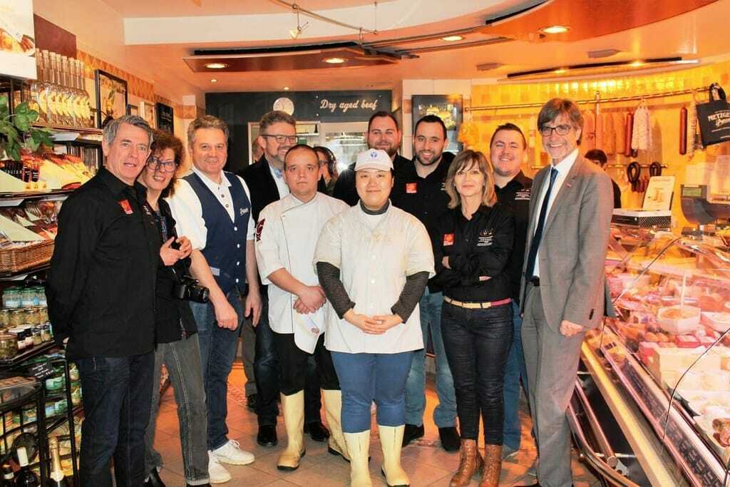 Besuch von Vertretern der Kammern aus Südfrankreich und Oberfranken bei Jérémy Burguin (fünfter von links) und Metzgermeister Helmut Parzen (dritter von links). In der Bildmitte: Soogeong Geong aus Südkorea. - © Handwerkskammer für Oberfranken