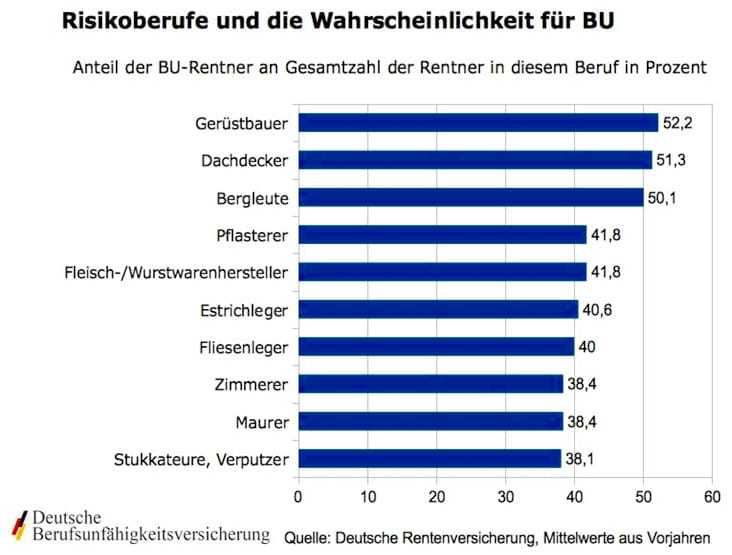 Experten schätzen, dass jeder fünfte Arbeitnehmer vor Erreichen des Rentenalters erwerbsunfähig wird. Natürlich haben nicht alle einen Unfall. Allerdings sind vor allem körperlich schwer arbeitende Handwerker gefährdet. Die Chancen, dass etwa ein Gerüstbauer berufsunfähig in den Ruhestand gehen muss, stehen sogar fünfzig zu fünfzig. Auch bei den Fleisch- und Wurstwarenherstellern schaffen es 42 Prozent nicht, bis zur Rente ihren Beruf auszuüben. Gleiches gilt für Pflasterer.