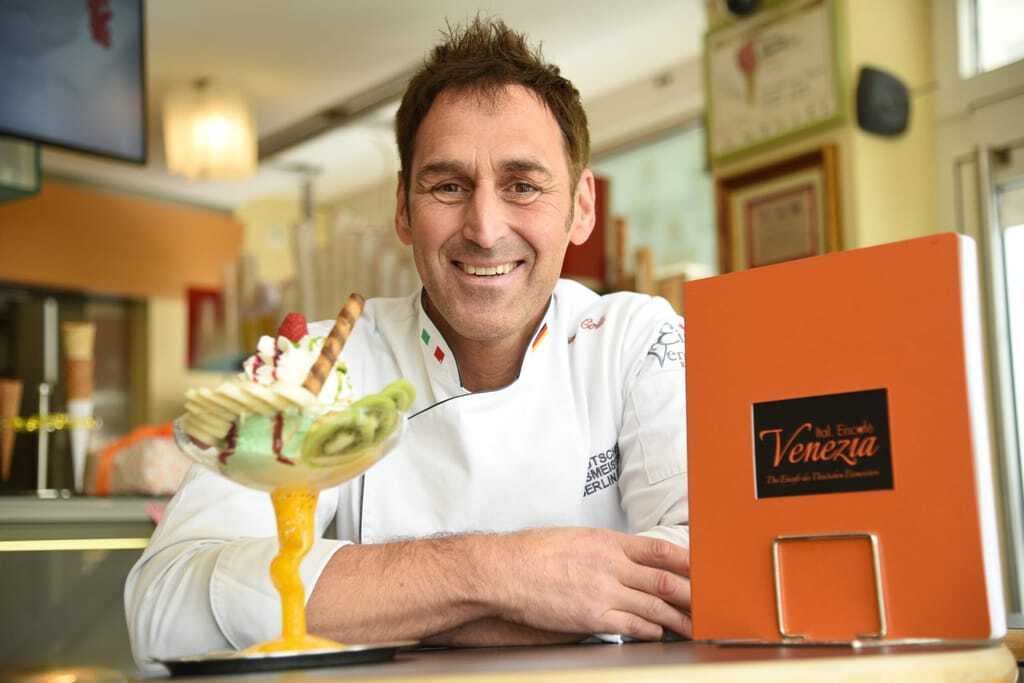In den Vitrinen thronen selbst gebackene Kuchen und Desserts von der Erdbeerrolle bis zum italienischen Tiramisu. Hinter dem Tresen steht ein Mann mit wuscheligen braunen Haaren und großen haselnussbraunen Augen. Es ist Adriano Colle, Inhaber und Gelatiere des Eiscafés Venezia.