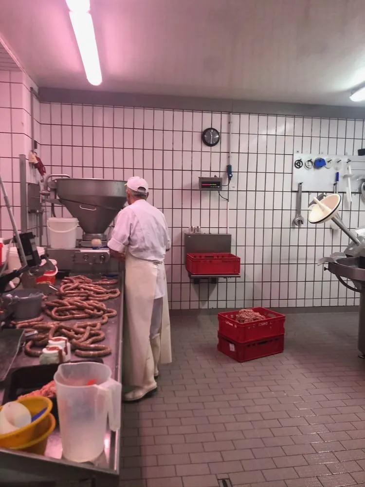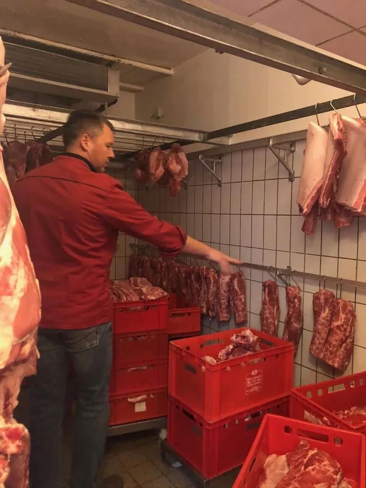 Diese Leidenschaft für das Handwerk merkt man Dees sofort an. Er steht mitten in der Produktion der Metzgerei Dees in Würzburg Zellerau. Die Räume sind gefliest, helles Neonlicht bestrahlt jede Sehne des Schweins, jeden Muskelstrang des Rinds, jede Federfaser des Huhns. Der Geruch ist schwer aber zugleich leicht, stechend aber zugleich lieblich. Und Dees fällt mit seiner roten Metzgerkochjacke, seinem verschmitzten Lächeln, den langen Beinen in ausgewaschenen Blue Jeans und den grauen Crocs auf. Hier ist sein "Revier".