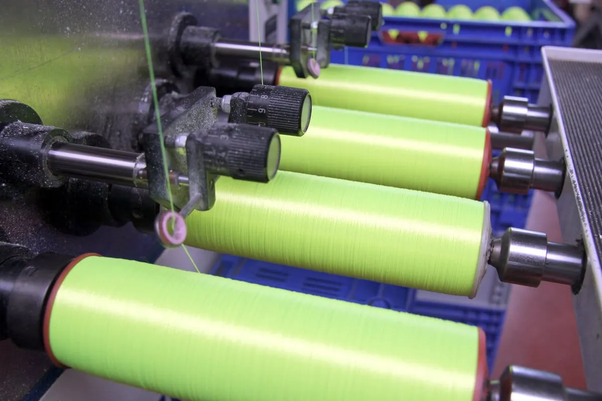 Moderne Herstellung: Auf dieser halbautomatischen Spulmaschine mit Klöppelspulen werden hochfeste Garne aus neongelbem Sonder-PES-Material verflochten. Das Endprodukt sind Richtschnüre mit Durchmesser von zwei bis vier Millimetern.