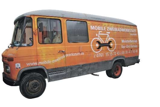 Und seit Gründung ihres Unternehmens bietet Knöfel Fahrrad-Aktionstage an. Sie fährt bei Unternehmen vor und inspiziert die Räder der Angestellten, damit diese gesund und sicher zur Arbeit kommen. Regelmäßig gebucht wird sie dafür vom Universitätsklinikum Freiburg und vom regionalen Energieversorger Badenova. Bei diesen Aktionen nutzt die Freiburgerin ihren neuen Anhänger, der ihr ganzer Stolz ist. Den alten Mercedes will sie erst in zwei Jahren austauschen. Denn das Fahrgestell und der Motor sind technisch zwar noch einwandfrei, doch der Lack bekommt immer mehr Risse.
