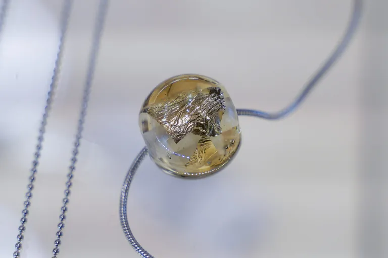 An ihrem Arbeitstisch rollt sie nun die Glaskugel über ein Stückchen handgeschlagenes Blattgold, vorsichtig, damit die heiße Kugel das hauchdünne Edelmetall nicht verbrennt. Anschließend versiegelt Julia Förster-Oetter die runde Perle erneut mit einer Schicht Klarglas. Die Glasperle wird nun über Nacht im Ofen stufenweise heruntergekühlt. Das härtet die Oberfläche aus, so dass die Glasperle nicht zerspringt. Wie zum Beweis wirft die Goldschmiedin eine Perle auf den Boden und fängt sie auf, als die Kugel wie ein Tischtennisball wieder in die Höhe springt. "Bitte nicht nachmachen", sagt Julia Förster-Oetter lächelnd nach ihrer Beweisführung.