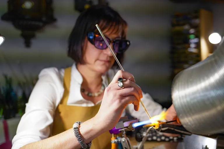 In ihren Kreationen kombiniert sie die Metalle, schmilzt Gold und Silber ins Glas hinein. "Mein Ziel ist es, Glas mit Goldschmieden zu verbinden." Form, Farbe und Gestaltung sind keine Grenzen gesetzt, solange das Glas warm ist.