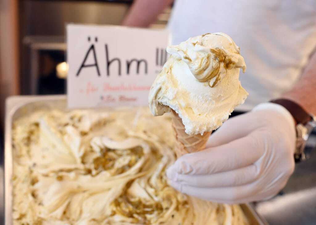 Er kreierte ein Milcheis aus weißer Schokolade, vermischt mit Pistazien-Crunch. "Sieht aus wie Eisbergsalat", sagt er. Und sei so lecker, dass "Ähm" in seiner Eisdiele hinter Vanille das derzeit am meisten verkaufte Eis sei. "Schmeckt Kindern und Erwachsenen", sagt er.