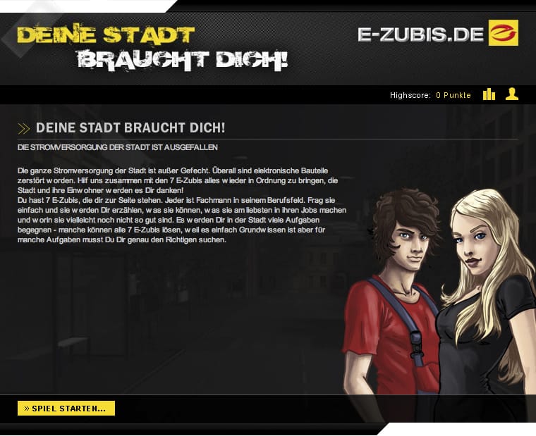 Wer bringt die Einbruchmeldeanlage in der Boutique am schnellsten wieder in Gang? Wer den defekten Fahrstuhl im Krankenhaus? Und wer repariert die Medientechnik im Tonstudio oder die Bürosysteme bei der Polizei? Beim Berufs-Check-Spiel der E-Handwerke auf Facebook retten junge Menschen eine Stadt, in der die Stromversorgung ihren Geist aufgegeben hat. Die Aufgabe der Spieler ist es, zusammen mit den E-Zubis alles in Ordnung zu bringen, damit die Einwohner wieder versorgt sind. Mit flotter Denke und Fingerspitzengefühl machen sich die Spieler auf den Weg zum Highscore und erfahren ganz nebenbei, was in den E-Handwerken abgeht.