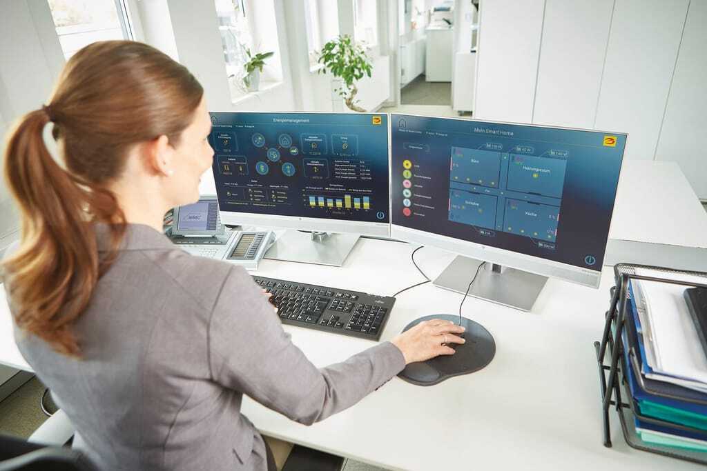 Eine Empfangsmitarbeiterin kontrolliert das Energiemanagement eines Gebäudes. - © ArGe Medien im ZVEH