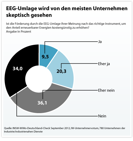 Die EEG-Umlage gerät immer stärker in die Kritik der Wirtschaft – und mit ihr die Planungen der Bunderegierung zur Energiewende. Wie eine aktuelle Umfrage ergab, lehnt eine deutliche Mehrheit der deutschen Unternehmen die Umsetzung der Energiewende in der bisherigen Form ab. Sorgen machen sich die Betriebe um die steigenden Kosten und ihre Wettbewerbsfähigkeit.
