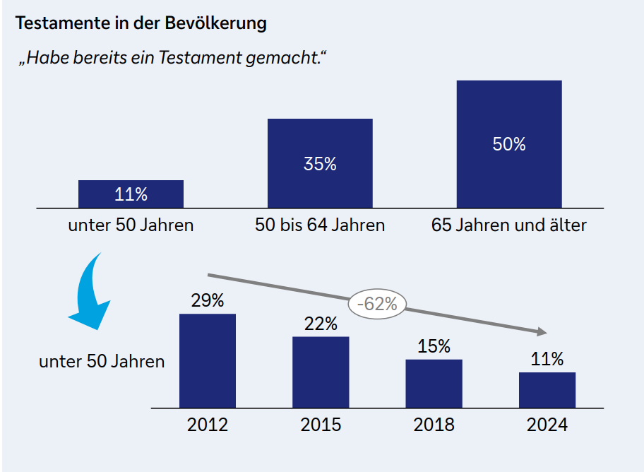 Die Quote der Menschen, die vor der Lebensmitte ein Testament machen, sinkt in Deutschland seit Jahren. Waren es 2012 noch 29 Prozent der unter 50-Jährigen, die ihre Vermögensnachfolge geregelt hatten, sind es heute nur noch elf Prozent. Ab 65 Jahren sieht dieses Bild dann ganz anders aus: Hier hat jeder zweite bereits ein Testament gemacht.