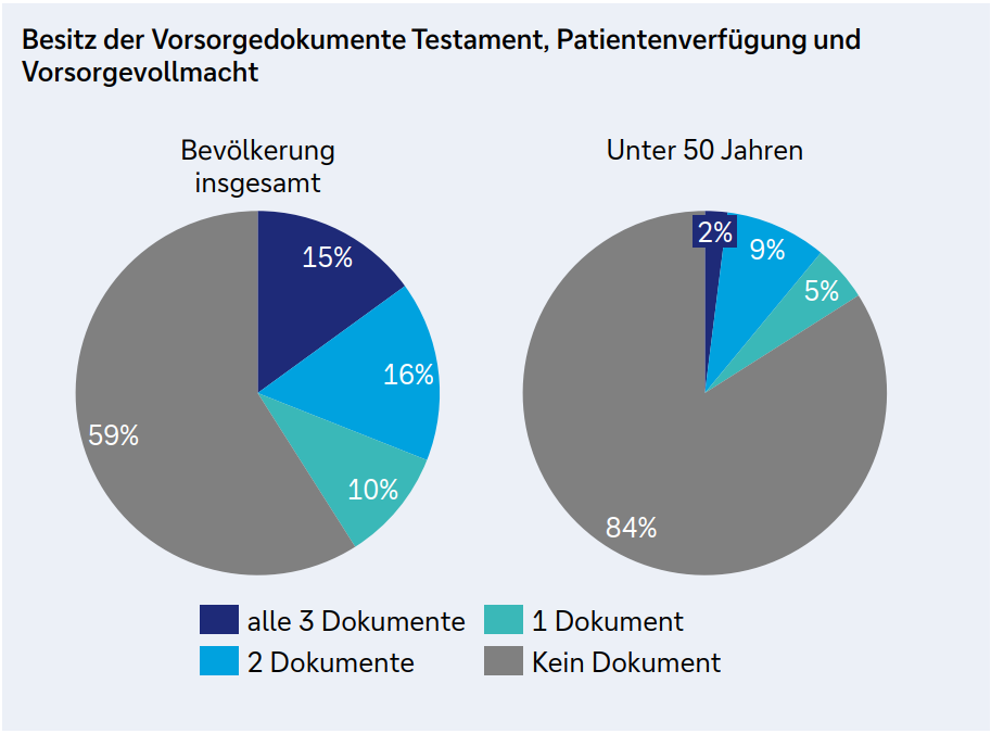 Obwohl Experten immer wieder klar machen, dass auch jüngere gut beraten sind, sich auf das eigene Ende vorzubereiten, haben nur 16 Prozent der unter 50-Jährigen überhaupt Regelungen getroffen. Umfassend vorbereitet, mit Testament, Patientenverfügung und Vorsorgevollmacht sind in dieser Altersgruppe sogar nur zwei Prozent. Mit steigendem Alter wächst das Bewusstsein für die Notwendigkeit solcher Vorkehrungen, aber auch in der Gesamtbevölkerung haben deutlich mehr als die Hälfte gar keine entsprechenden Dokumente.