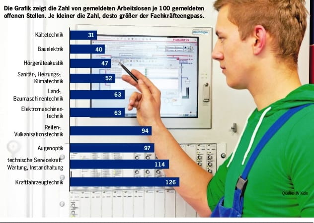 Wer derzeit eine Ausbildung als Kältetechniker macht, braucht keine Sorgen um einen Arbeitsplatz zu haben. Denn Kältetechniker sind extrem gesucht. Auf 100 gemeldete offene Stellen kamen zwischen August 2011 und Juli 2015 durchschnittlich nur 31 gemeldete Arbeitslose. Das ergab eine Studie des IW Köln. Es ist demnach der Beruf mit den größten Fachkräfteengpässen.