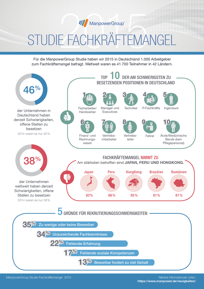 Für die Studie hat die ManpowerGroup im ersten Quartal 2015 weltweit rund 41.700 Personalverantwortliche in 42 Ländern befragt, ob sie Schwierigkeiten haben, Stellen zu besetzen und welche Berufsgruppen am schwierigsten zu finden sind. dhz