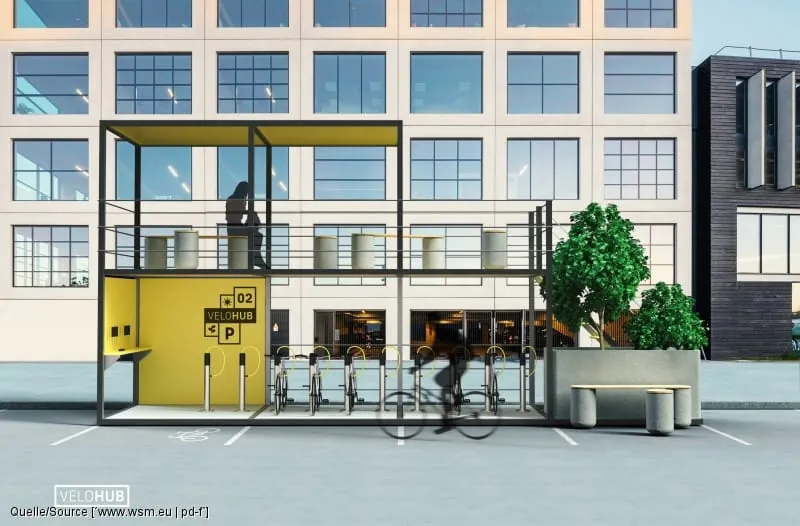 Fahrräder spielen eine große Rolle bei der Verkehrswende. Doch besonders in Großstädten ist nur wenig Platz für die entsprechende Infrastruktur vorhanden. Wie aus zwei Autoparkplätzen eine modulierbare Fahrradstation gemacht werden kann, zeigt jetzt das Projekt "Velohub". Neben (überdachten) Fahrradstellplätzen, bietet es sogar die Möglichkeit Werkstatt, Ladesäule, Verweilort, Gepäckaufbewahrung oder Imbissstand zu integrieren.