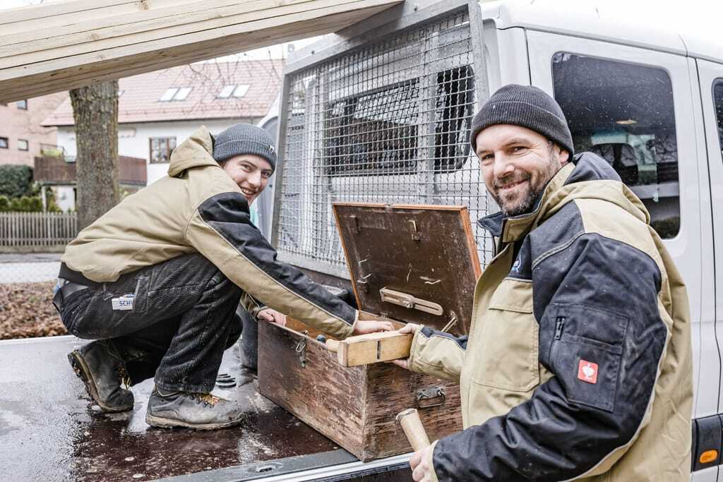Die Arbeitszeit beginnt ab dem Hof, wenn Zimmerermeister Marcus Grabrucker (rechts) mit seinem Azubi Marius ­Mayrhofer zur Baustelle fährt. - © Stefanie Baum