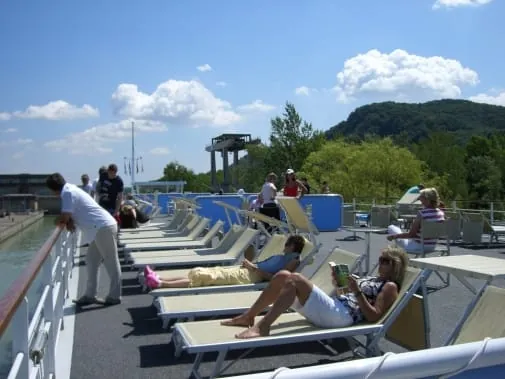 Die Kabinen sind rund 16 m² groß und bieten ausreichend Platz. Am Fenster zieht das Ufer gemächlich an einem vorbei und mit 23 km/h geht es Richtung Wien. Bis dahin ist es jedoch noch ein weiter Weg. Um genauer zu sein 350 km und neun Schleusen müssen bis zum Ziel überwunden werden. Gerade an das Durchschleusen muss sich der Passagier erst gewöhnen: Auf einmal ist es vorbei mit der schönen Aussicht und es türmen sich meterhohe Betonwände vor dem Fenster auf. Besonders in der Nacht traut man zunächst seinen Augen nicht, wenn die Lichter der am Ufer stehenden Häuser leuchten sollten, eine graue Masse vor dem Fenster erscheint. In der ersten Nacht dürfte diese Begebenheit den einen oder anderen noch aus dem Schlaf reißen. Doch je länger die Reise dauert, umso mehr hat man sich daran gewöhnt.