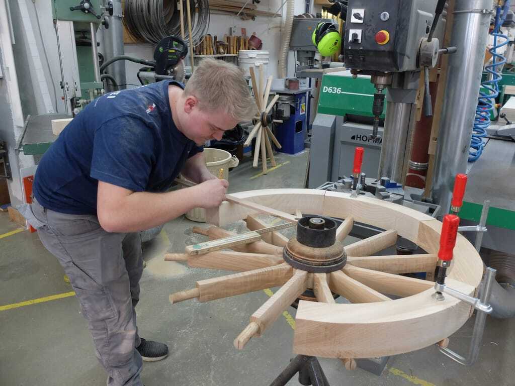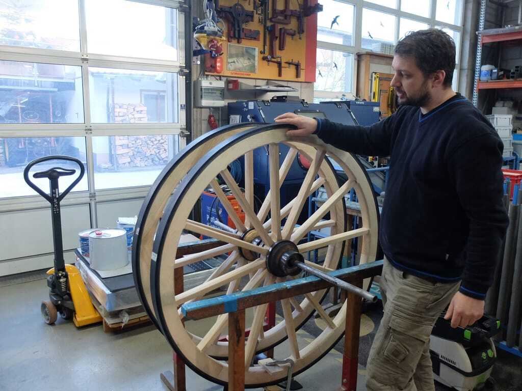In der Werkstatt arbeitet Thomasberger an den Holzrädern für den nächsten Wagen. Der Schreinermeister hat bereits das Grundgerüst der Räder fertiggestellt. Diese Konstruktion setzt sich aus einer Radnabe und zwölf in die Nabe eingelassenen Speichen zusammen. Er nimmt eines der unfertigen Räder und beginnt es mit einem speziellen Zapfenschneider zu bearbeiten. Helle Holzspäne fliegen durch die Luft und der süßliche Duft von Eschenholz macht sich in der Werkstatt breit. Speiche um Speiche rundet der Schreinermeister die Enden der vierkantigen Hölzer zu sogenannten Speichenzapfen ab. "Alle Holzbestandteile unserer Räder sind aus Esche", erklärt Pistner. Das astfreie Holz stamme aus dem heimischen Odenwald und werde bis zu sieben Jahre lang luftgetrocknet. "Das Holz eignet sich perfekt für Wagenräder, weil es so elastisch und biegsam ist."