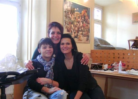 Friseurinnen mit sozialem Engagement (von links): Azubine Daria Mohr, Meisterin Anja Kern und Friseurin Leyla Cängür in der Provisorischen Friseurstube im Freiburger Essenstreff. - © Freiburger Essenstreff