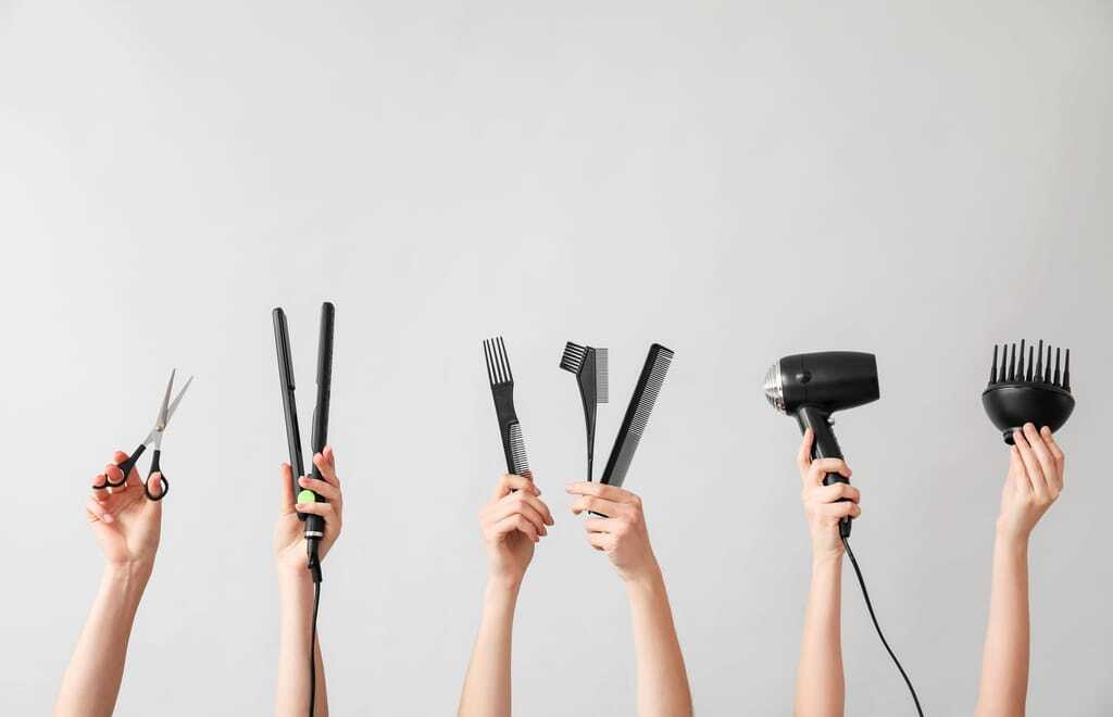 Hände mit verschiedenen Friseurutensilien ragen in die Luft.