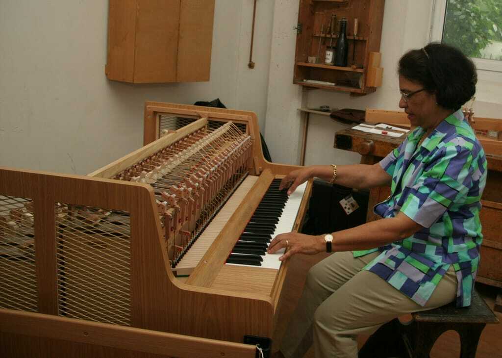 Geschäftsführerin und Pianistin Elianne Schiedmayer bei der Qualitätskontrolle: Erst wenn es sich wirklich gut spielen lässt, ist die Celesta fertig. - © Geimer