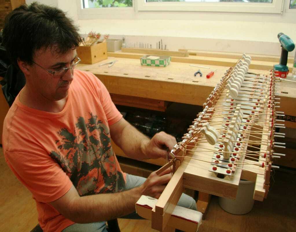 Bis auf die Tastatur besteht die Celesta nur aus Einzelteilen, die in Wendlingen entstehen. Die Schreiner bauen das Gehäuse aus Buche und Eiche. In vielen Einzelschritten erstellen die Mitarbeiter aus Birnenholz und Filz die Spielwerke.