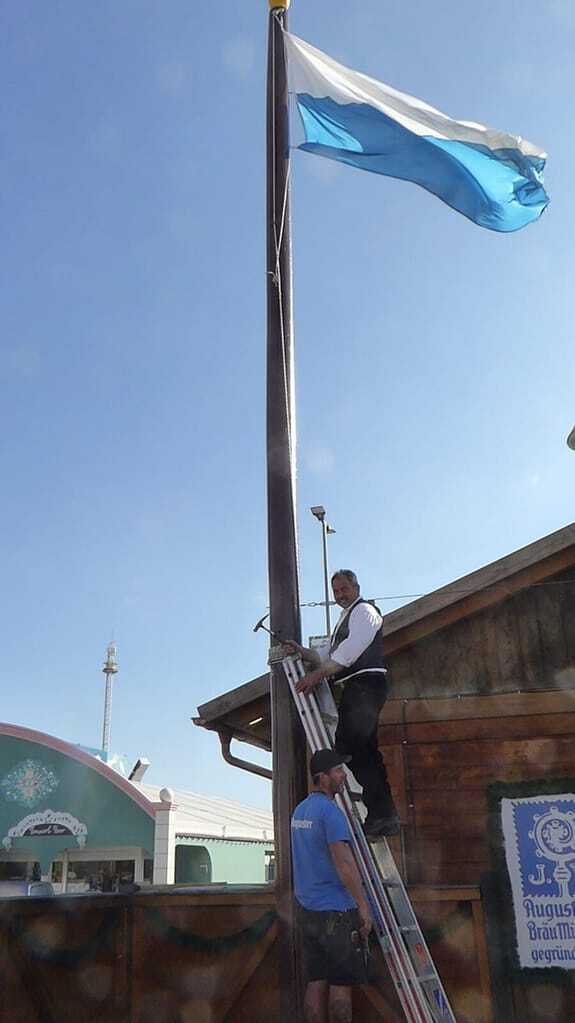 Auch der Rest der Mannschaft ist am liebsten im Augustiner-Zelt zu finden. Im "eigenen" Zelt lässt es sich eben am besten feiern. Dieses Jahr gab es sogar etwas Besonderes zu feiern. Manfred Thoma, bald 59 Jahre alt, durfte zu seinem 35-jährigen Firmenjubiläum eine besondere Tradition übernehmen, die eigentlich nur dem Firmenchef zusteht. Zum Hebauf der Handwerker, zwei Tage vor offiziellem Wiesn-Start, durfte er die letzte Fahne der rund 17 Mai-Bäume im Außenbereich des Zeltes hochziehen. "Das war schon wirklich toll. Sie hatten mich damit total überrascht", so Thoma. Im selben Atemzug erzählt er, wie sehr er seinen Job liebt und auch den Werkstoff Holz. Am liebsten sei er ganz oben auf den Dächern. Und noch mehr schätze er, dass seine Arbeit auch Köpfchen verlangt. Auch nach seiner Rente könnte er sich vorstellen, noch ab und an im Betrieb aufzuhelfen. "Mein Beruf ist ein guter Grund aufzustehen."