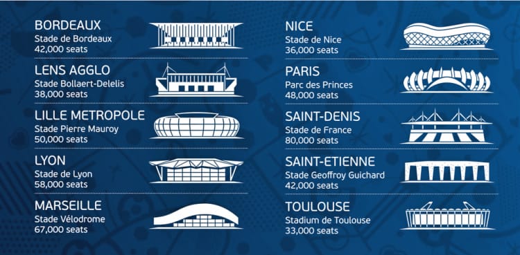 Aufgrund der höheren Anzahl an Spielen, wurde auch die Anzahl der Austragungsorte auf zehn erhöht. Das Eröffnungsspiel sowie das Finale finden im Stade de France in Paris statt. Das sind die Austragungsorte: