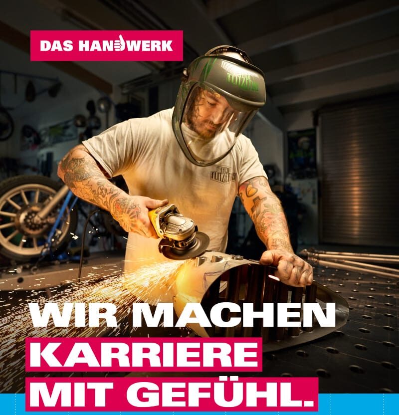 © handwerk.deMax Schneiderbanger zeigt seinen Ausbildungsberuf als Karosserie- und Fahrzeugbauer auf einem der neuen Plakate der Imagekampagne des deutschen Handwerks.