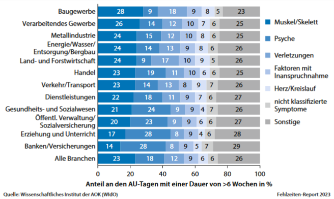 © Fehlzeitenreport 2023 des Wissenschaftliches Instituts der AOK (WIdO)Wer am Bau für mehr als sechs Wochen krank ist, hat vor allem Probleme mit Muskeln oder Skelett, selten aber mit der Psyche. Im Gesundheits- und Erziehungswesen ist es andersherum.