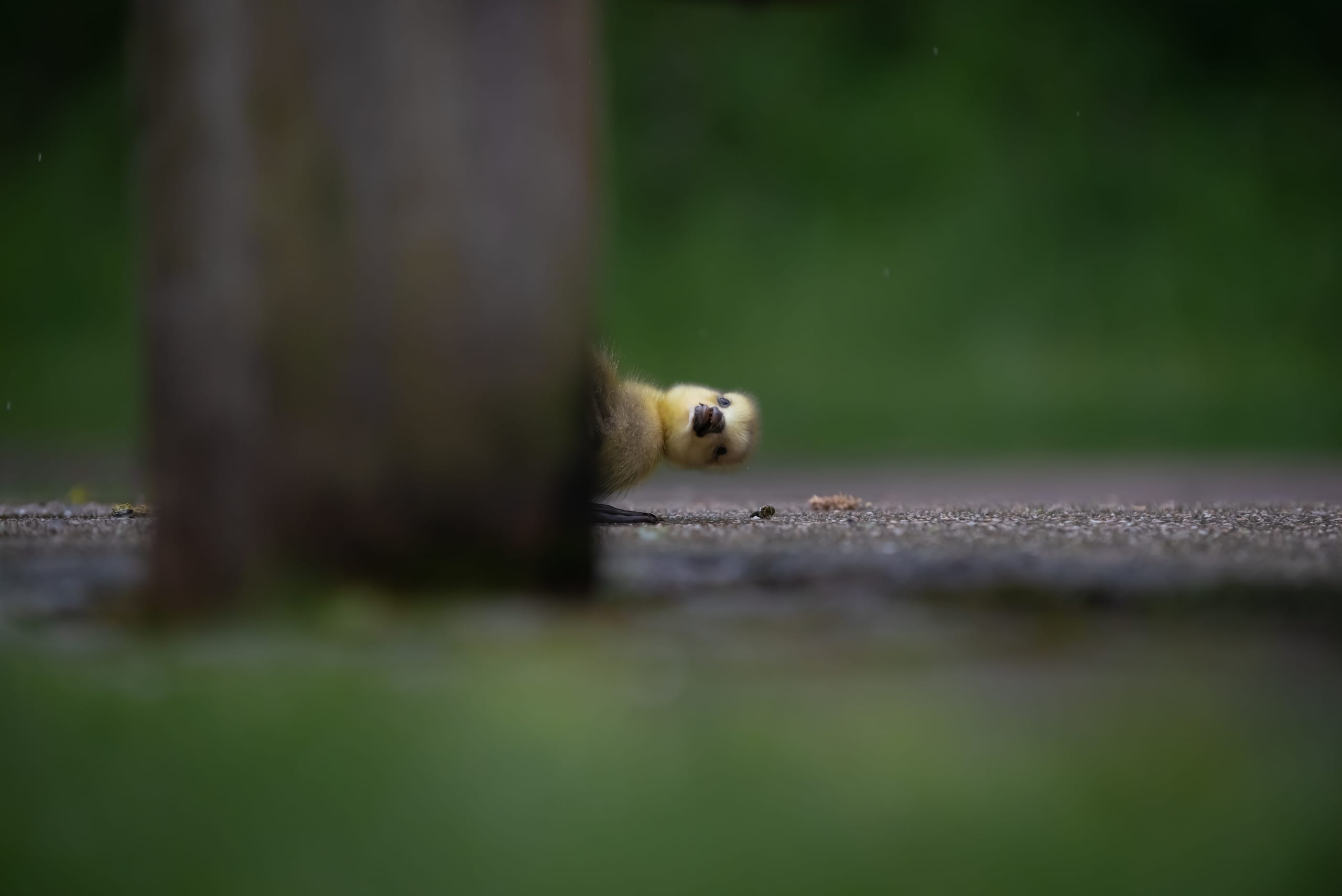 © Charlie Page / Comedy Wildlife Photography Awards 2021Mal schauen, ob die Luft rein ist: Dieses Gänseküken hat sich von seiner Gruppe gelöst und hinter einer Bank versteckt. Abgelichtet im Lee Valley Park, London. -