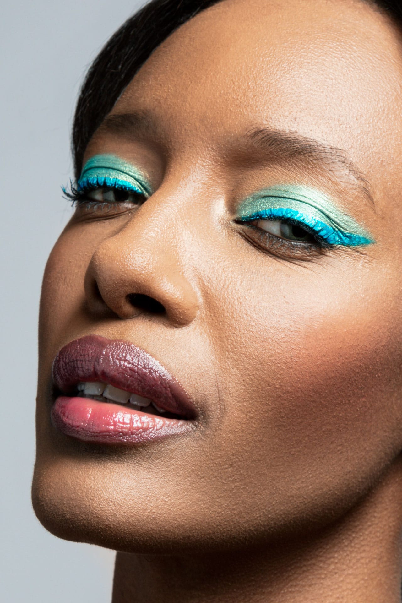© ZV Friseurhandwerk_Erwin WenzelColourful Flowers: Ein mintgrüner Lidschatten mit goldenem Schimmer auf dem beweglichen Lid lässt die Augen strahlen. Noch stärker in den Fokus setzt sie ein geschwungener Eyeliner in Türkis. Schwarzer Kajal auf der unteren Wasserlinie und kräftig schwarz getuschte Wimpern verleihen dem Make-up mehr Ausdruck. Dezentes Rouge in Pink und braunroter Lipgloss unterstreichen den Look.