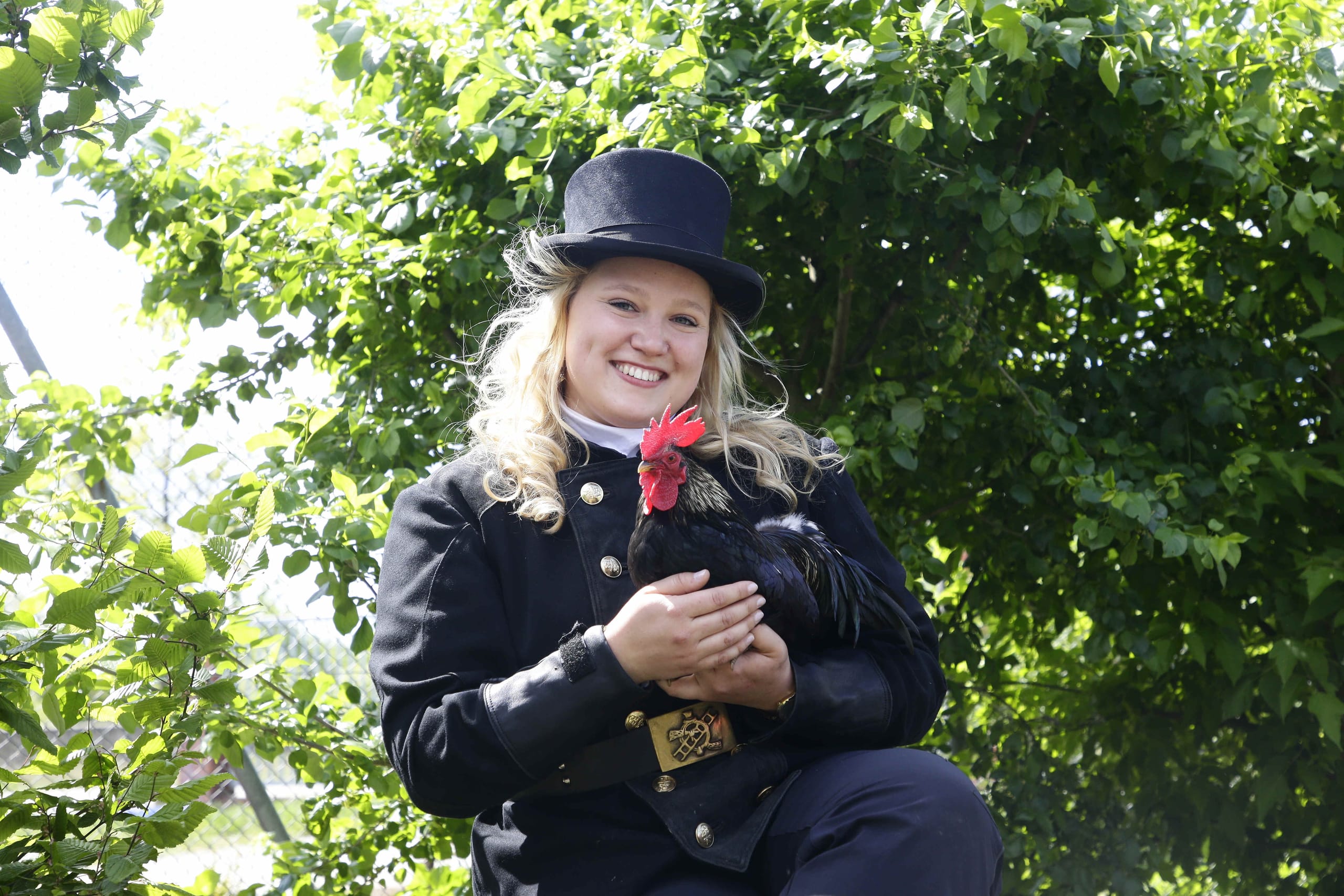 © Schornsteinfeger-Innung Berlin/Jessica MaiwaldAuch Tiere mit schwarzem Federkleid dürfen im Kalender nicht fehlen. Das Bild zeigt Hahn Azubi mit Schornsteinfegermeisterin Lea Bürkle. Einige der tierischen "Kalender-Stars" aus den letzten Ausgaben konnten sogar in ein neues Zuhause vermittelt werden. -