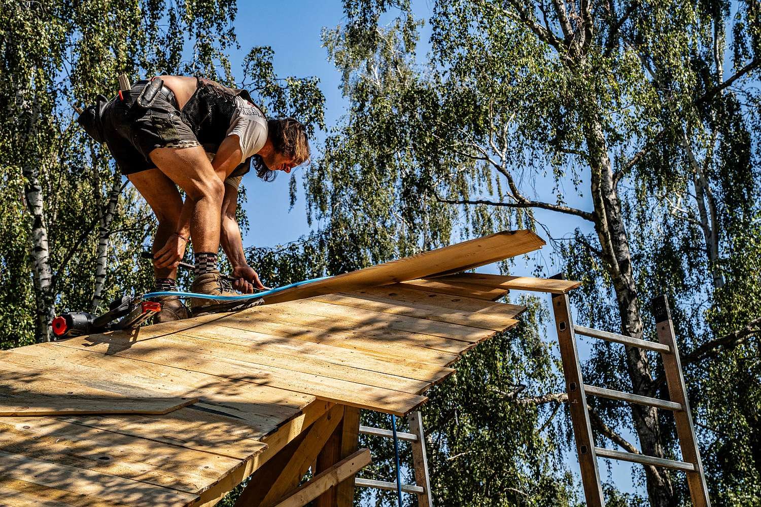 Während der Walz organisieren die Wandergesellen Sommerbaustellen. Dort arbeiten sie ehrenamtlich für gemeinnützige Projekte. Hier hilft Strolch – ein fremder freireisender Schreiner aus der Oberpfalz – bei der Sanierung des in die Jahre gekommenen Spielplatzes an den Lübschützer Teichen.