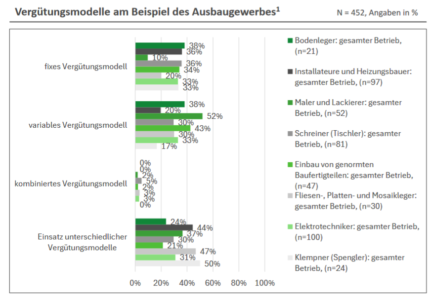 © Grafik: Entgeltsysteme und Incentives im Handwerk/Ludwig-Fröhler-InstitutInnerhalb des Ausbaugewerbes wählen Maler und Lackierer sowie Fliesen-, Platten- und Mosaikleger am seltensten fixe, Installateure und Heizungsbauer sowie Klempner am seltensten variable Vergütungssysteme. -