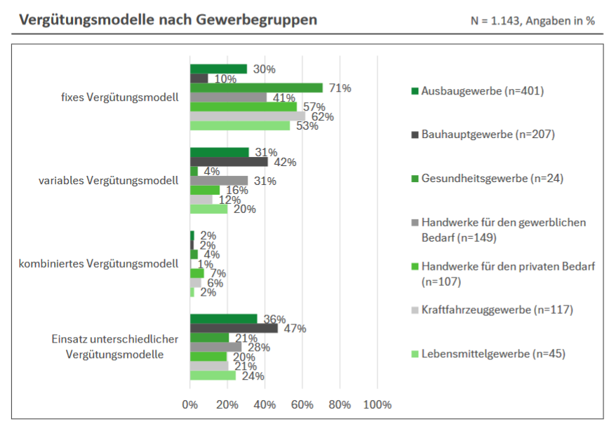 © Grafik: Entgeltsysteme und Incentives im Handwerk/Ludwig-Fröhler-InstitutKleinere Betriebe bevorzugen fixe Vergütungsmodelle, die weniger aufwendig sind in der Bearbeitung. Je größer der Betrieb, desto vielfältiger die Vergütungsmodelle. -