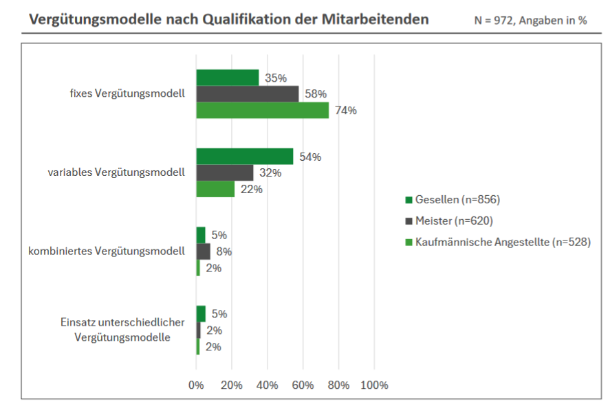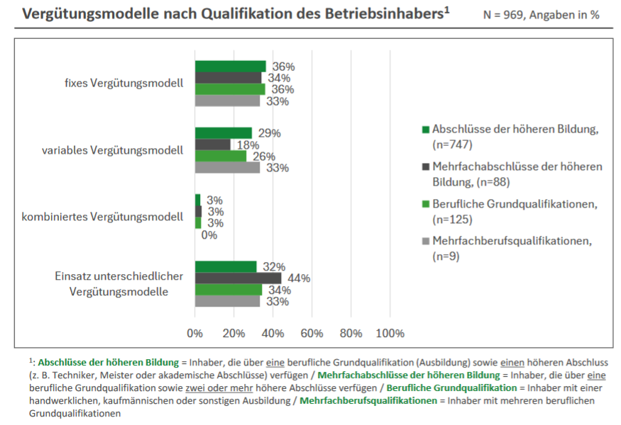 © Grafik: Entgeltsysteme und Incentives im Handwerk/Ludwig-Fröhler-InstitutBei der Wahl der Vergütungsmodelle spielt auch die Qualifikation des Betriebsinhabers eine Rolle. -