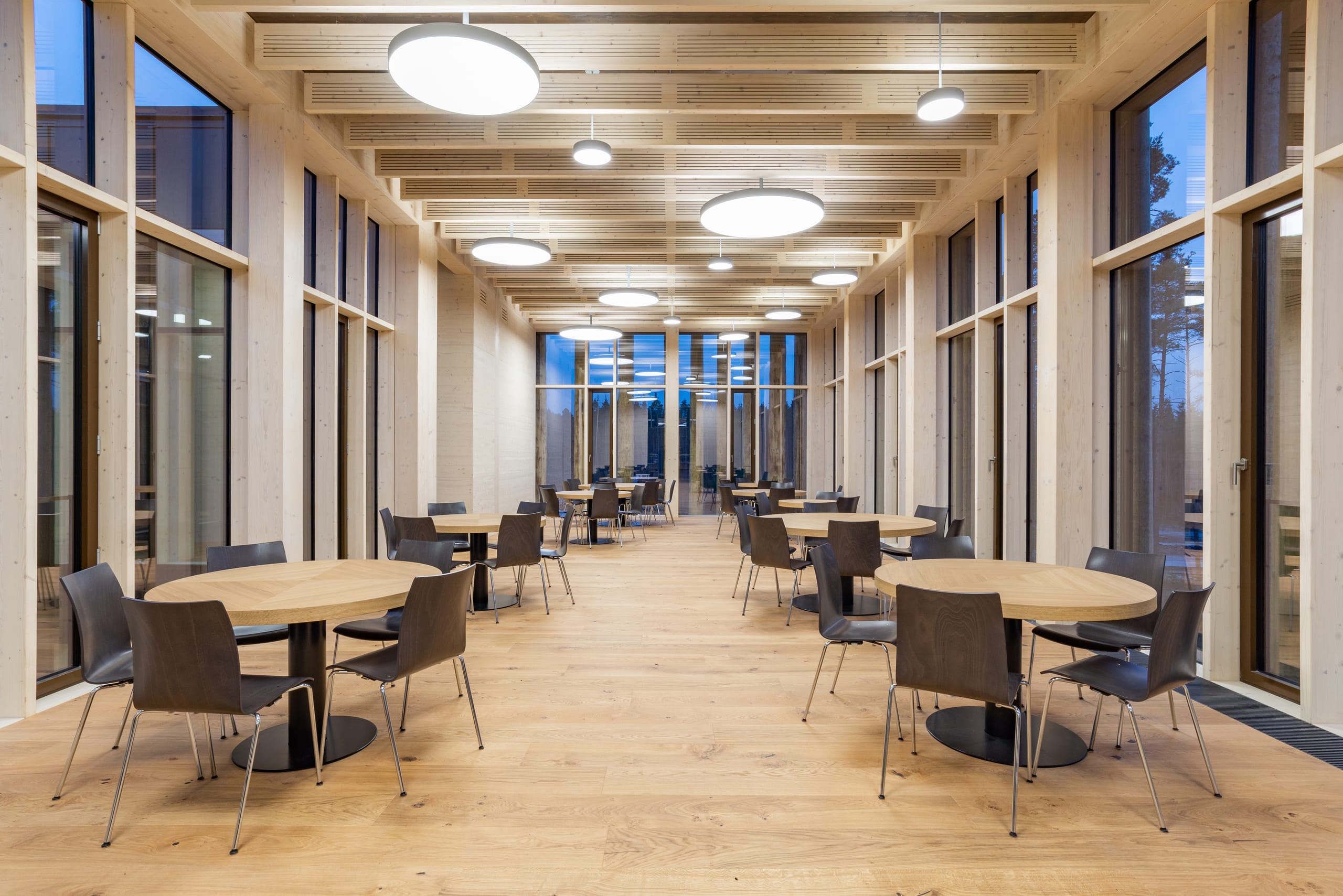© MJU-FotografieDer Naturbaustoff Holz ist bestimmend im neuen Büro- und Verwaltungskomplex, der traditionell zur Ausrichtung des Unternehmens passt. Die Blickbeziehung zum Produktionsgeschehen soll hilfreich für alle Prozesse sein, der Blick in den Wald erholsam. -
