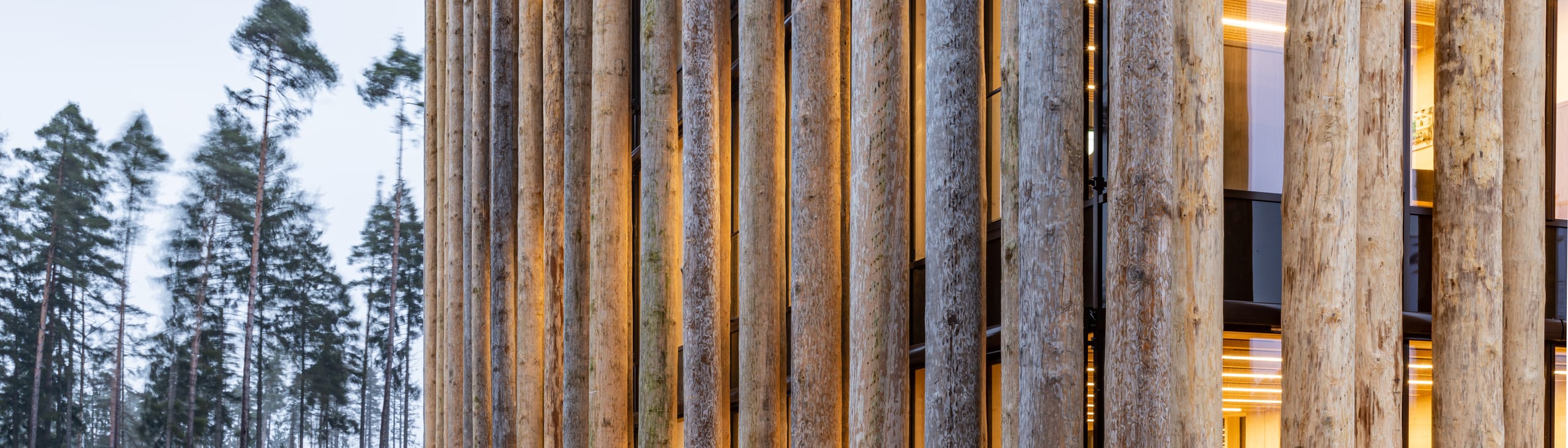 © MJU-FotografieAn der Fassade reihen sich 19 Meter hohe, geschälte Fichtenstämme senkrecht im lichten Abstand aneinander. Sie verkleiden die eigentliche Pfosten-Riegel-Konstruktion aus Metall, Holz und großzügigen Glaselementen des Bauwerkes. Durch diese robuste Baumfassade mit rund 200 Stämmen entsteht der Eindruck eines überdimensionalen Baumhauses. Getragen wird das enorme Gewicht von rund 1.000 kg je Fichtenbaumstamm durch einen separaten Fundamentstreifen. Weiteren Halt finden die Stämme durch Stahlschwerter, die an Dach und Decke des Untergeschosses angebracht wurden.