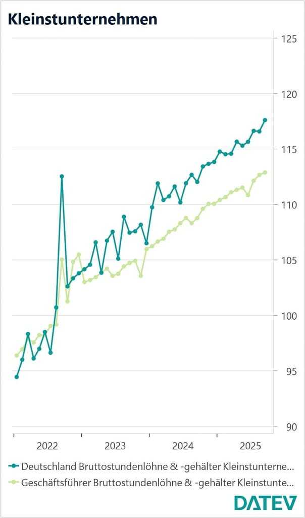 Die Gehälter der Geschäftsführer entwickeln sich auch bei unterschiedlichen Unternehmensgrößen unterdurchschnittlich. In Kleinstunternehmen mit unter zehn Mitarbeitern stiegen laut Datev-Geschäftsführer Robert Mayr die Bruttostundenlöhne seit 2022 um rund 17,6 Prozent, während die Geschäftsführergehälter lediglich um 12,9 Prozent zulegten. "Die Entwicklung hier ist weniger dynamisch als die Lohnentwicklung insgesamt. Das gilt auch für die Entgeltentwicklung in kleinen und mittelgroßen Unternehmen", so der Datev-Chef auf Anfrage der Deutschen Handwerks Zeitung.