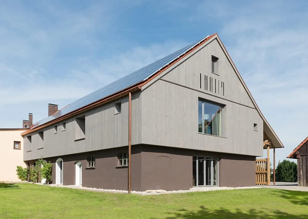 Von außen zeigt sich das ehemalige Landwirtschaftsgebäude als modernes Haus in dezenten Farben.